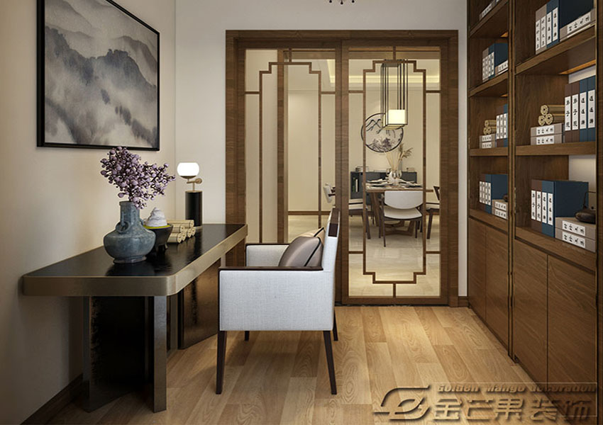 木質(zhì)的地板和紅木色的書(shū)柜交相呼應(yīng),書(shū)柜上的竹卷、書(shū)籍是對(duì)文化歷史傳承,門(mén)帶著中式元素。