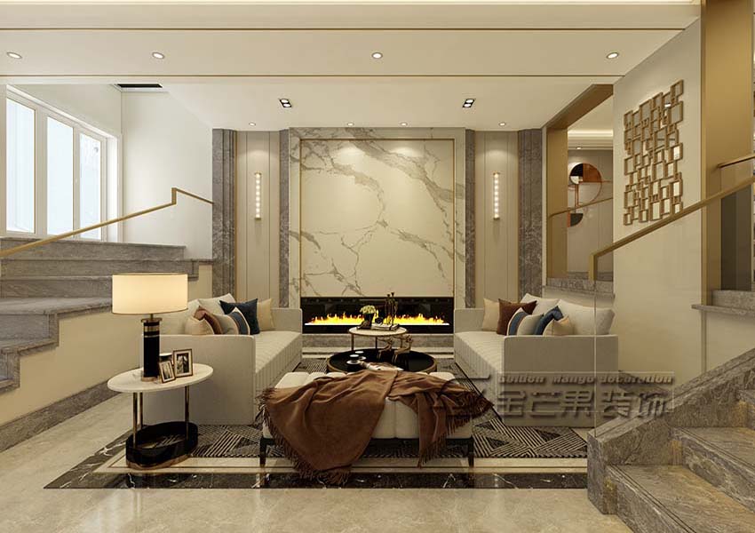 兩層挑高的客廳,大方、包容。在墻壁上搭配豐富的線條元素做搭配,裝點墻面,電視背景墻鑲嵌一整塊紋理豐富的大理石,盡顯屋主人的貴氣和品味。超大的落地窗為整個大空間的采光通風做了巨大貢獻,同時大型的水晶吊燈、射燈 、燈帶在晚上取著不可代替的作用。軟裝的搭配有了巴洛克的味道。