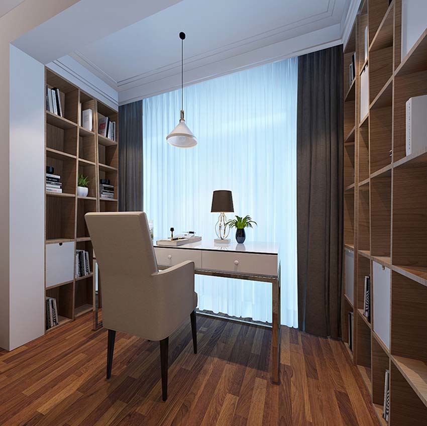 書房并沒有太多的裝潢,一張書桌和一把椅子就成了書房的主角,木質(zhì)的地板和柜體搭配和諧,整齊的格子承載著淵博的知識(shí),色彩上以醒目的白色為主,提神醒腦也是一個(gè)不錯(cuò)的選擇。