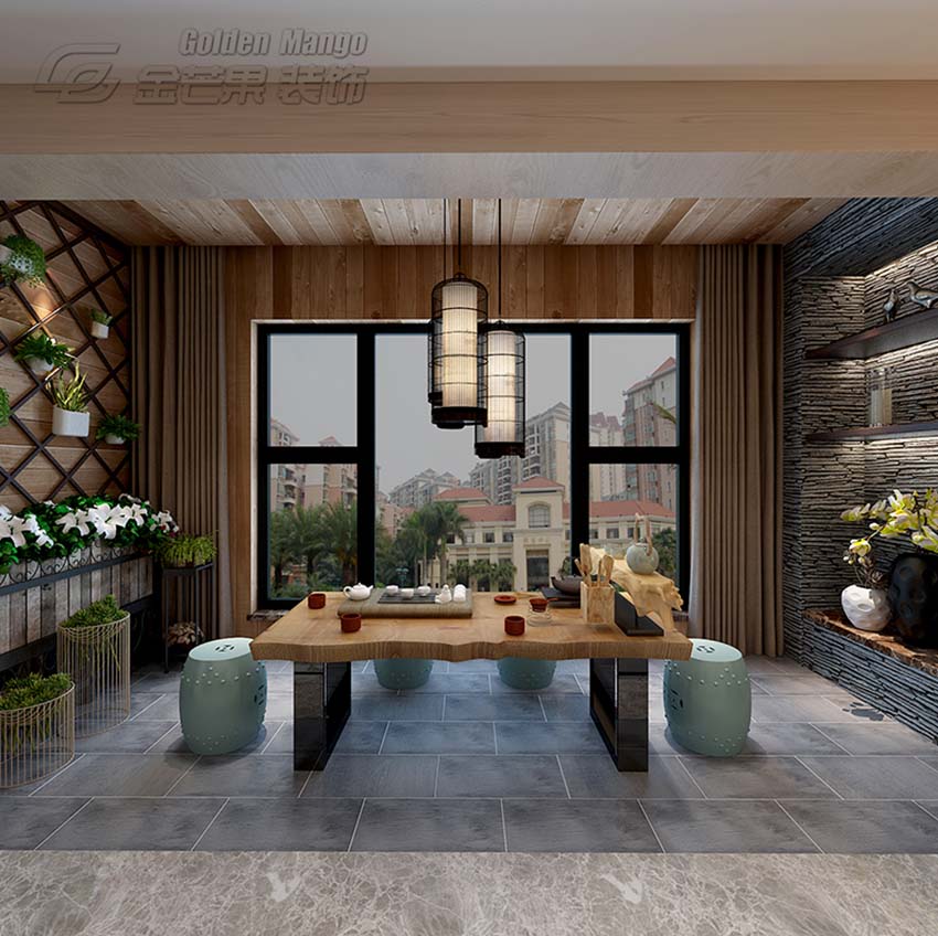 品茶區(qū),采用大量的木材,滿鋪到天花板到茶桌,質(zhì)感上的體驗(yàn)很強(qiáng),灰色的地磚和凳子帶著歷史的氣息,墻壁用小石條鑲嵌,拉近空間和大自然的距離,郁郁蔥蔥的植物則顯得清新自然。