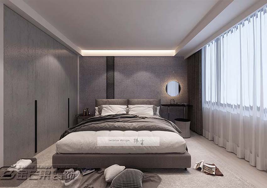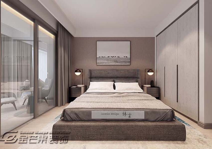 落地的玻璃推拉門隔開成臥室,在風格上顯得開放、大方。臥室的陽臺和客廳的陽臺相互連接,生活、時尚、享受、獨一無二。臥室里透露著簡與素,在色彩的運用游刃有余。光,以床頭柜的兩個白熾燈和陽臺頂的燈帶光線為主,注重休息上的體驗。