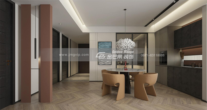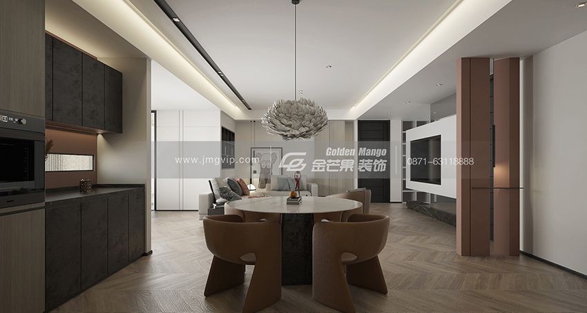 磚紅色和梨木色相搭配,意境十足。客廳、餐廳、書房的布局,空間感覺更加強烈。客廳面積寬大的地毯也保證了舒適性。頂上星星點點的射燈,加上燈帶的設計顯得空間上更具有穿透力。
