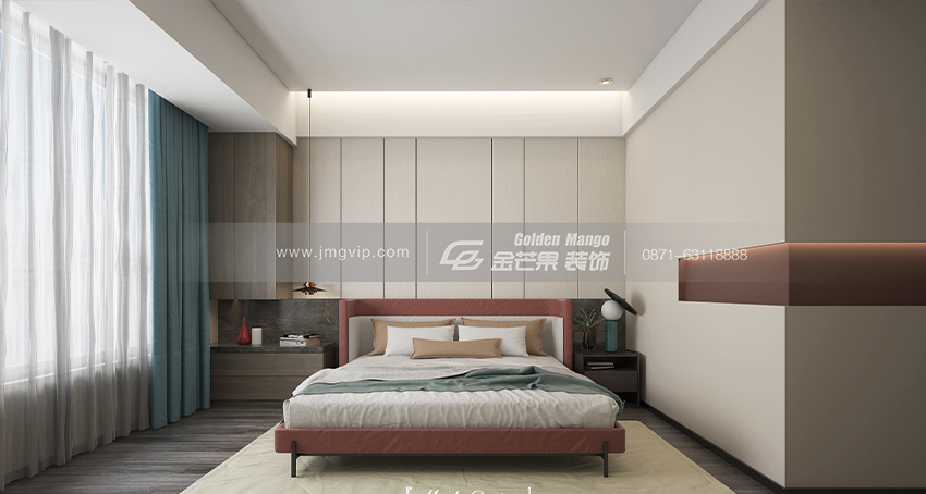 床體的顏色和客廳的顏色相互照應,包含式的床頭則有較強的安全感、更安心。運用視覺感強烈的線條元素進行搭配,墻體的設計則顯得藝術感十足。依舊沒有主燈的布置,以落地吊燈和桌面臺燈進行搭配。