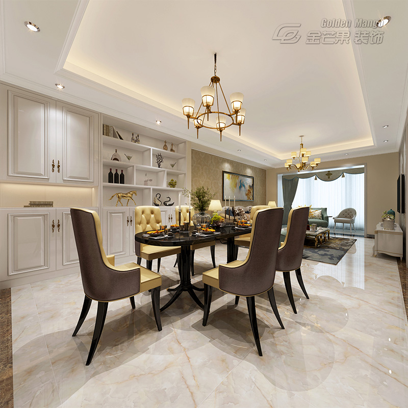 浪漫是這里最大的優(yōu)勢,凹凸有致的椅子,金色的座面和巧克力色的背面,成為了顏值擔當,黑色餐桌有小巧玲瓏的感覺。柜體的設(shè)計依舊是歐式風格里最經(jīng)典的。餐廳和客廳隔而不斷的布局設(shè)計,讓整個空間更顯得寬敞,視覺也有很好的延伸。