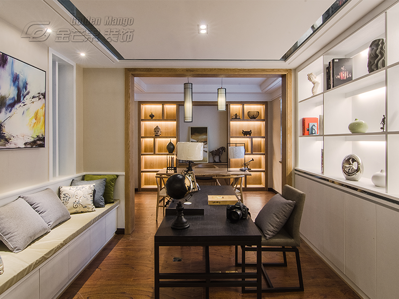 休息、學習、活動、會友一應俱全,卡座代替傳統椅子、凳子,體驗度很好。柜體格子上面的飾品和藏品折射出屋主人的懷舊情懷和對過往的珍惜,隱藏式的射燈和金屬條裝飾的吊頂,更顯得空間感和整體性更強,質感舒適的木質地板。
