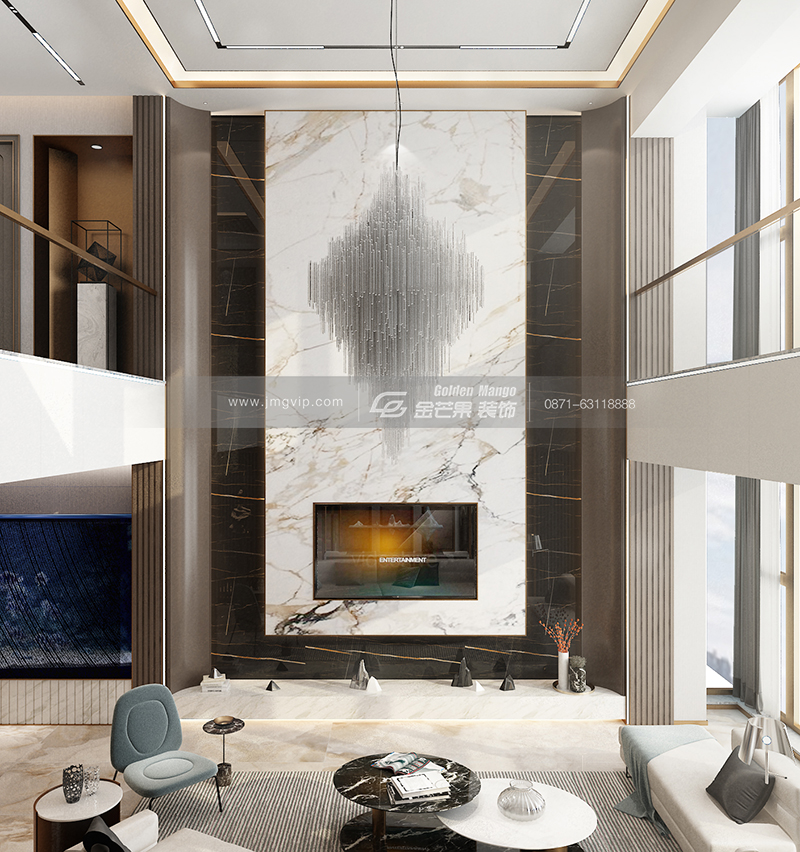 寬闊而不空曠的客廳空間,挑高的電視背景墻設(shè)計(jì),隨性又自由。石材和金色鐵藝結(jié)合的茶幾,輕松打造奢華高級(jí)感。非常具有設(shè)計(jì)感的客廳大吊燈,如夢似幻,優(yōu)雅大氣。