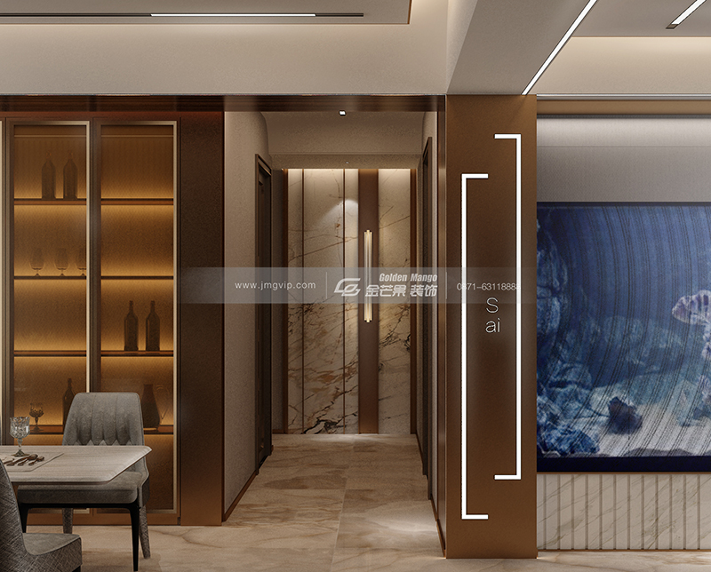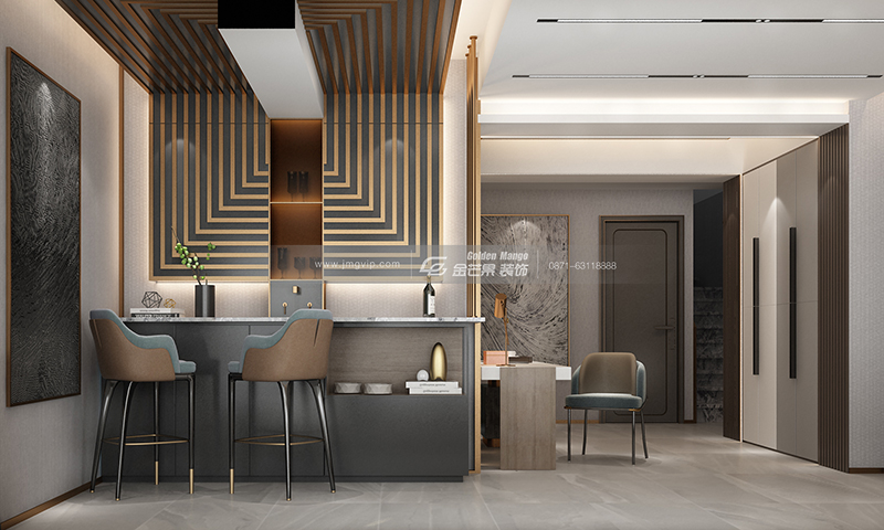 金屬質(zhì)地的吧臺(tái)椅呼應(yīng)整體空間,墻上的寫意裝飾畫簡而不減,奢而不膩。個(gè)性的酒柜設(shè)計(jì),讓人忍不住將視線聚集在此,空間的豐富層次感在此得以呈現(xiàn)。