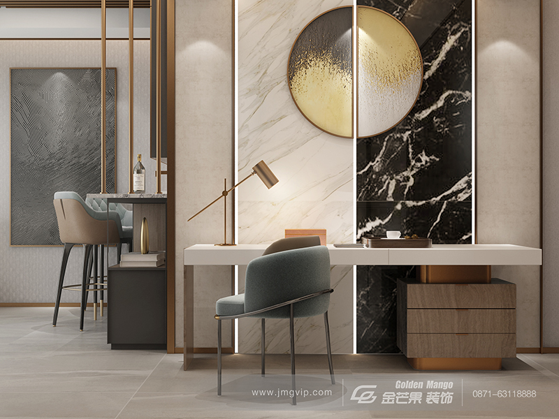 大量金屬色、金屬線條的運(yùn)用,打造奢華的高級(jí)感。淺色為主,棕色為輔的色調(diào),浪漫又優(yōu)雅,高級(jí)又氣質(zhì),不免讓人聯(lián)想起港式電影里光線昏黃的鏡頭,光影閃爍間,韻味盡顯。