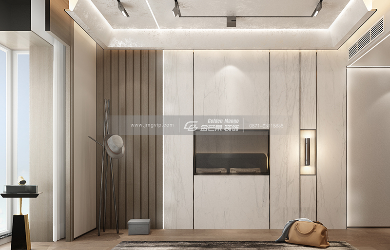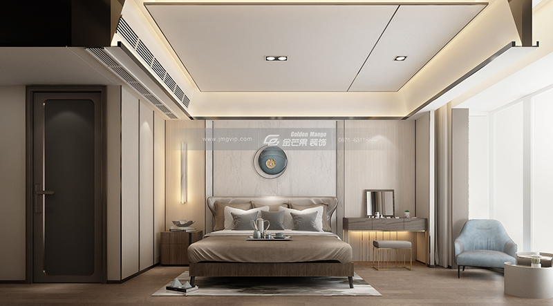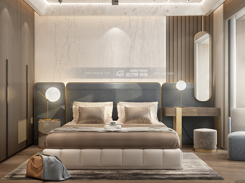 簡單,舒適,釋放身心的空間,區(qū)別于客餐廳棕色流金色調(diào)的營造,臥室以溫柔沉穩(wěn)的白色調(diào)為主。銀色的線條精美氣質(zhì),營造輕奢感。純色的床具在光線照射下呈現(xiàn)如水般流動(dòng)的絲滑感,奢華而不煩膩,貴氣而不張揚(yáng)。簡潔的床頭背景墻一抹清新的藍(lán)色,成為了臥室中的亮點(diǎn),溫潤彰顯,氣質(zhì)有余。