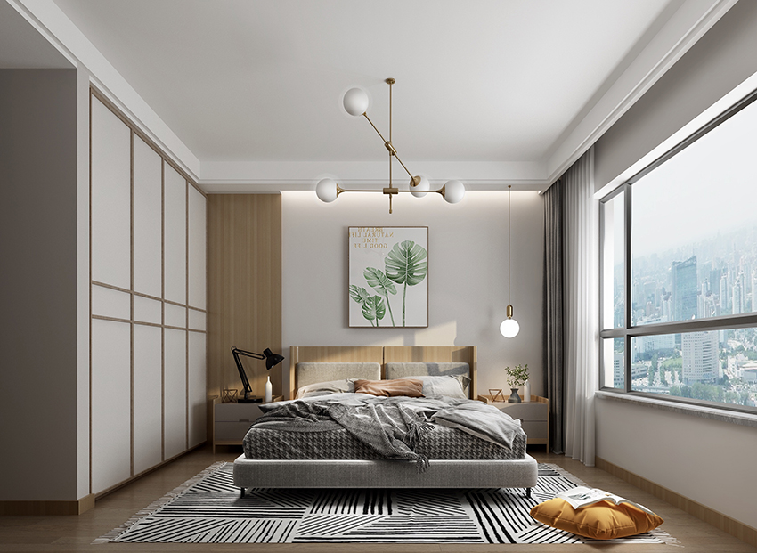 臥室延續整體空間白色和原木色的搭配,寬闊的衣柜帶來強大的收納功能,收進生活的細碎,收進一天的疲憊,騰出一片心靈的歸憩之地。條紋地毯增加藝術感,彰顯野性,灰色床具,是雅致,是沉靜,也是淡然。