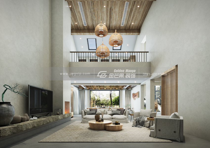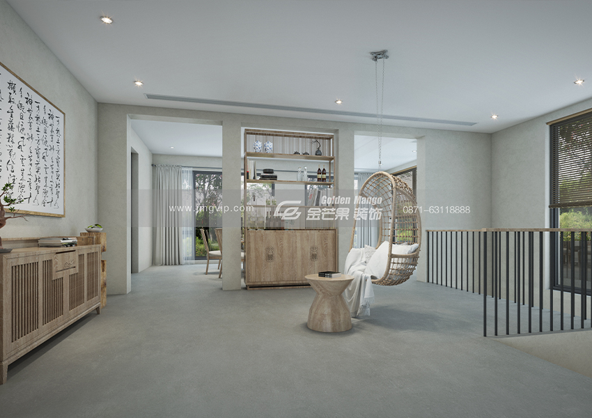 簡單的配色搭配原木的吊頂和家具,整個空間營造一種純粹、大氣、古樸的感覺。慵懶的沙發(fā)既舒適又時尚,簡單的茶幾回歸自然,吊燈既充滿設(shè)計感又為空間增添了溫馨、精致的感覺。客廳整體空間營造一種空靈、通透的感覺,讓身心得以釋放,有讓人置身叢林之感。