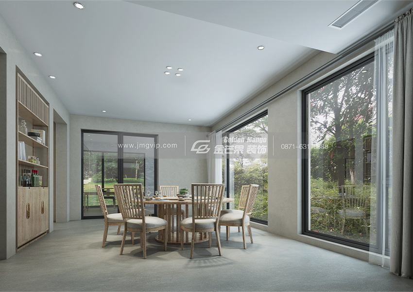 寬大的玻璃窗讓整個餐廳更精致了,搭配原木的餐座椅和櫥柜,既符合房間整體的格調(diào),又具有自然、精致之美。