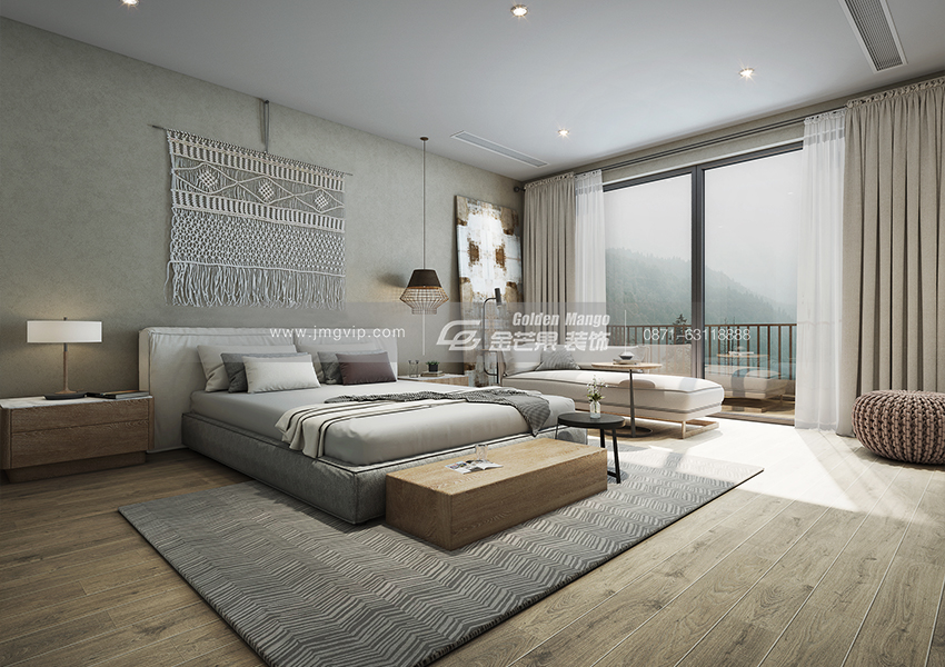 寬大的落地窗給房間帶來良好的采光,冷靜的色調(diào)讓人心也能跟著沉靜下來,木質(zhì)的地板增加房間溫馨感,簡單的灰白色窗簾和紗簾的搭配,讓房間看起來溫柔又慵懶。