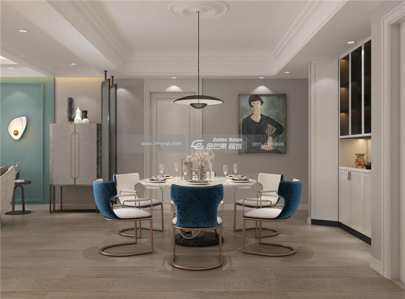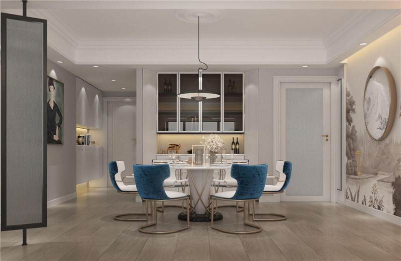 歐式的餐桌椅搭配簡約個性的吊燈,體現(xiàn)設(shè)計師的混搭巧思。歐式掛畫和具有東方美韻的大幅裝飾畫背景墻,淡雅又不失藝術(shù)感。間或穿插的金屬和玻璃,挑起靈動之美。