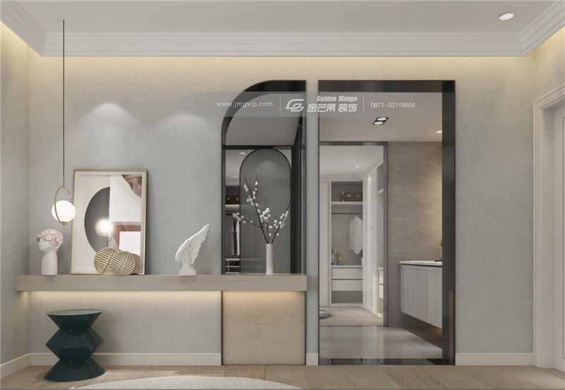 私密的臥室空間也是家居的重心,簡約的灰色調(diào)呈現(xiàn)低調(diào)的奢華,不規(guī)則的鏡子設(shè)計輕松打造空間藝術(shù)的一面,陶藝、雕塑、花束、個性簡約吊燈,抽象畫,材料的混搭令空間呈現(xiàn)一種個性質(zhì)感,細巧的小心思鋪陳開來,空間的細膩和精致也就隨之呈現(xiàn)。