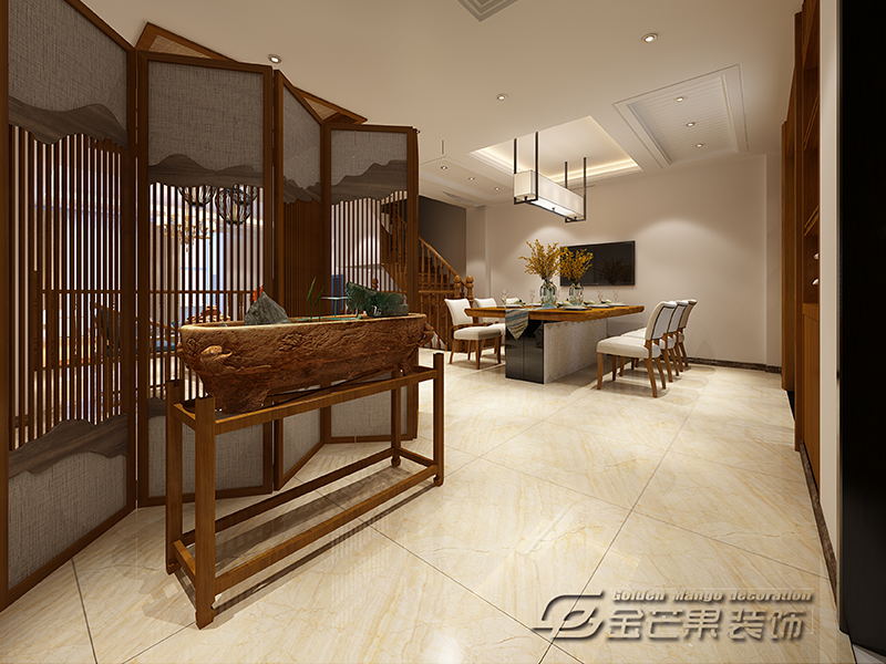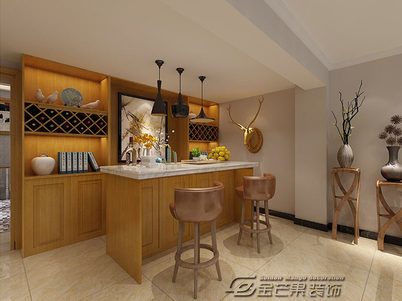 這里再一次實現了中西碰撞,西式的餐吧椅、吊燈、酒柜,搭配中式的選材和瓷器等擺件,非常具有特色。