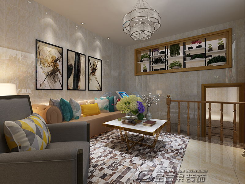 這是一個小型的客廳,整體空間大膽運用明艷張揚的色彩,使房間看起來很活潑,適合和親密的朋友一起聚會。墻上的裝飾畫令整個空間看起來更張揚但不夸張。桌子上的花束和墻上的鏤空花束增加房間的優雅氛圍,和個性的裝飾畫互相碰撞、互相協調,使整體上看上去非常舒服。