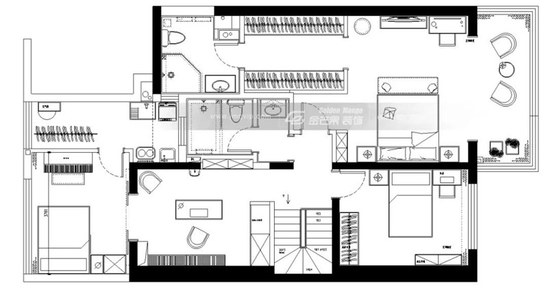 二樓空間比較零碎,將主臥相鄰的房間打通,設(shè)置成一個和主臥相連的大衣帽間,擴大可使用區(qū)域,同時也增加大量收納空間。
