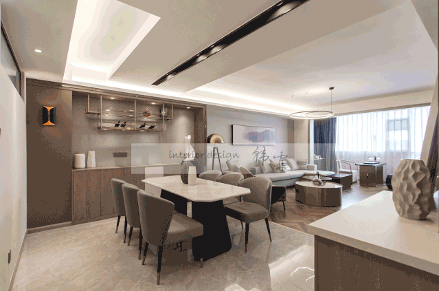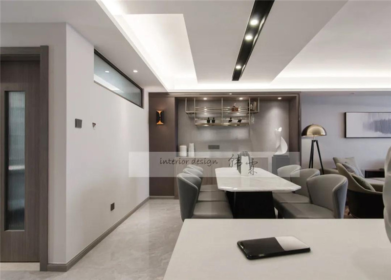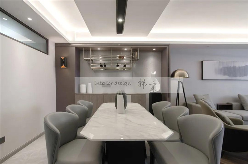 中心吧臺區(qū)域,灰色調(diào)和轉(zhuǎn)角處形成對比,一灰一白,一繁一簡,輕松打造高級感。柜體既做到了增加收納空間,又做到了功能區(qū)隔。