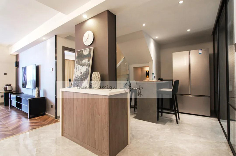柜體的背面,設(shè)計了寬大的落地鏡,廚房水吧區(qū)過道狹窄,落地鏡可起到視覺延伸的作用,增加通透的感覺。