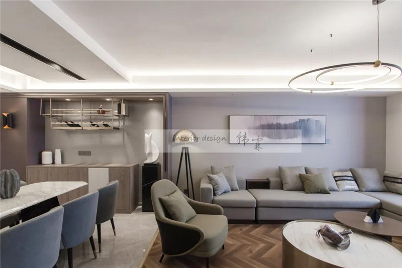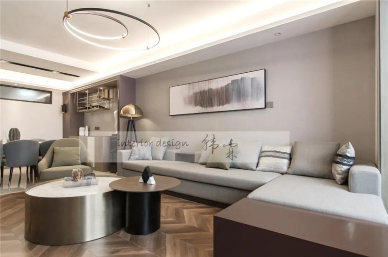 沙發(fā)的選用延續(xù)整體的優(yōu)雅色調(diào),金屬質(zhì)感主茶幾和邊幾,造型簡約,搭配簡約風(fēng)的燈飾,蘊含低調(diào)的奢華。