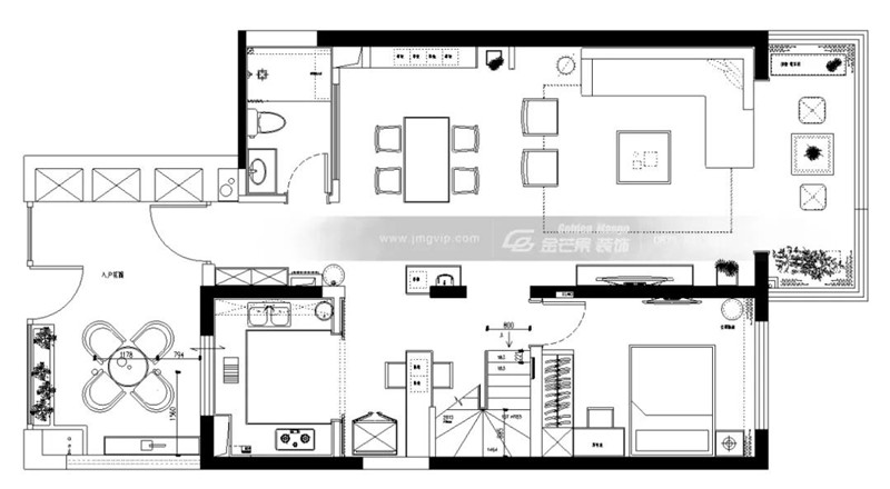 入戶轉(zhuǎn)角處摒棄常規(guī)的平轉(zhuǎn)角,設(shè)置了動線轉(zhuǎn)角,在進(jìn)出門之間形成空間對話。