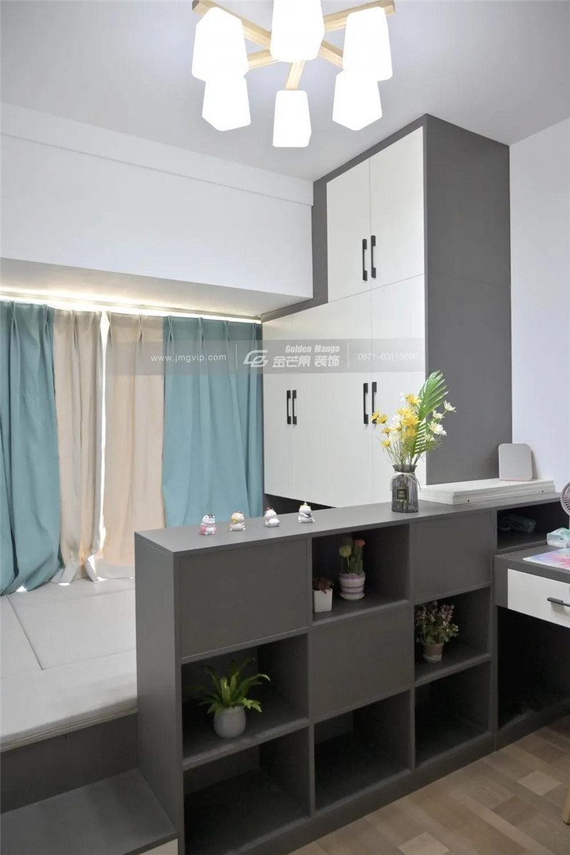 床頭設計吊柜,增加收納空間。旁邊的柜體,既可以收納東西,又可以作為桌子來使用,同時可以起到隔斷的作用,這樣的設計讓房間不管是在實用性還是溫馨感上都增加了不少。