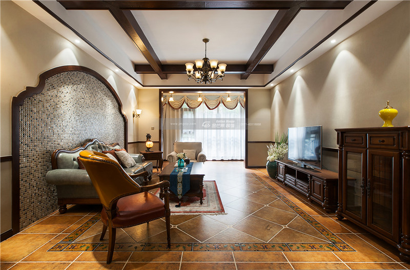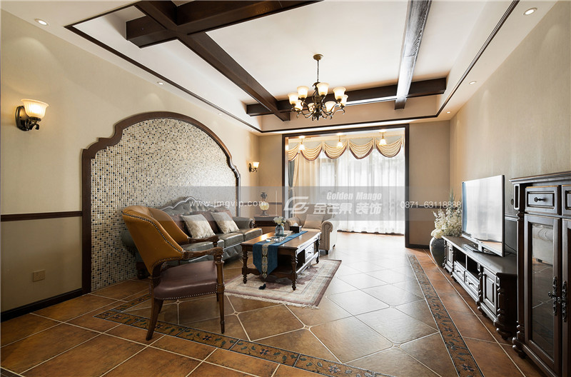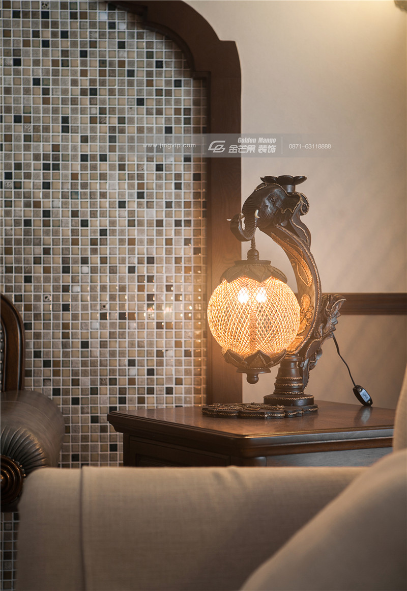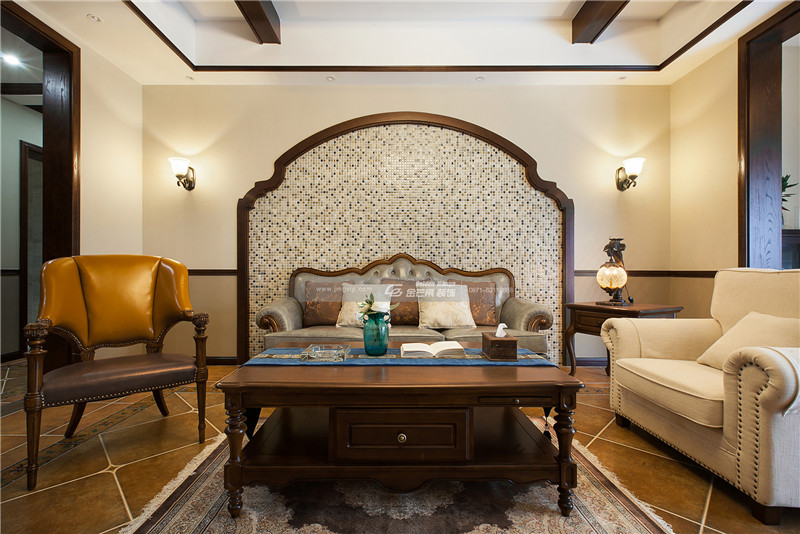 馬賽克沙發(fā)背景墻跳躍的顏色讓整體空間活潑了起來,石材是冷靜、利落,木材是溫厚、舒心,一剛一柔,碰撞出個性、豐富的空間感。