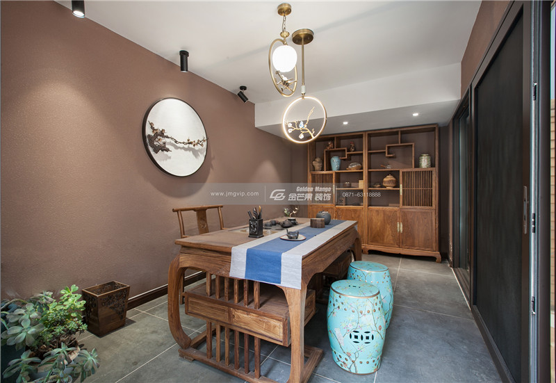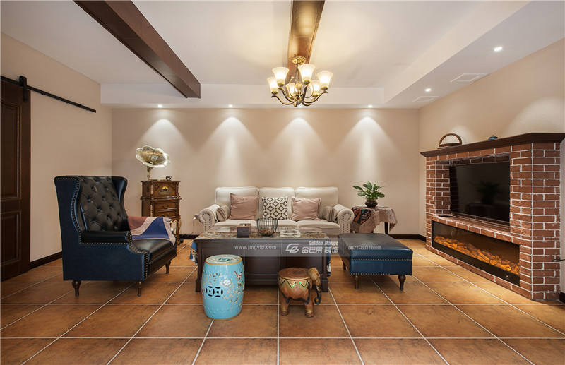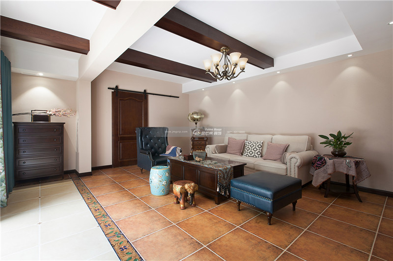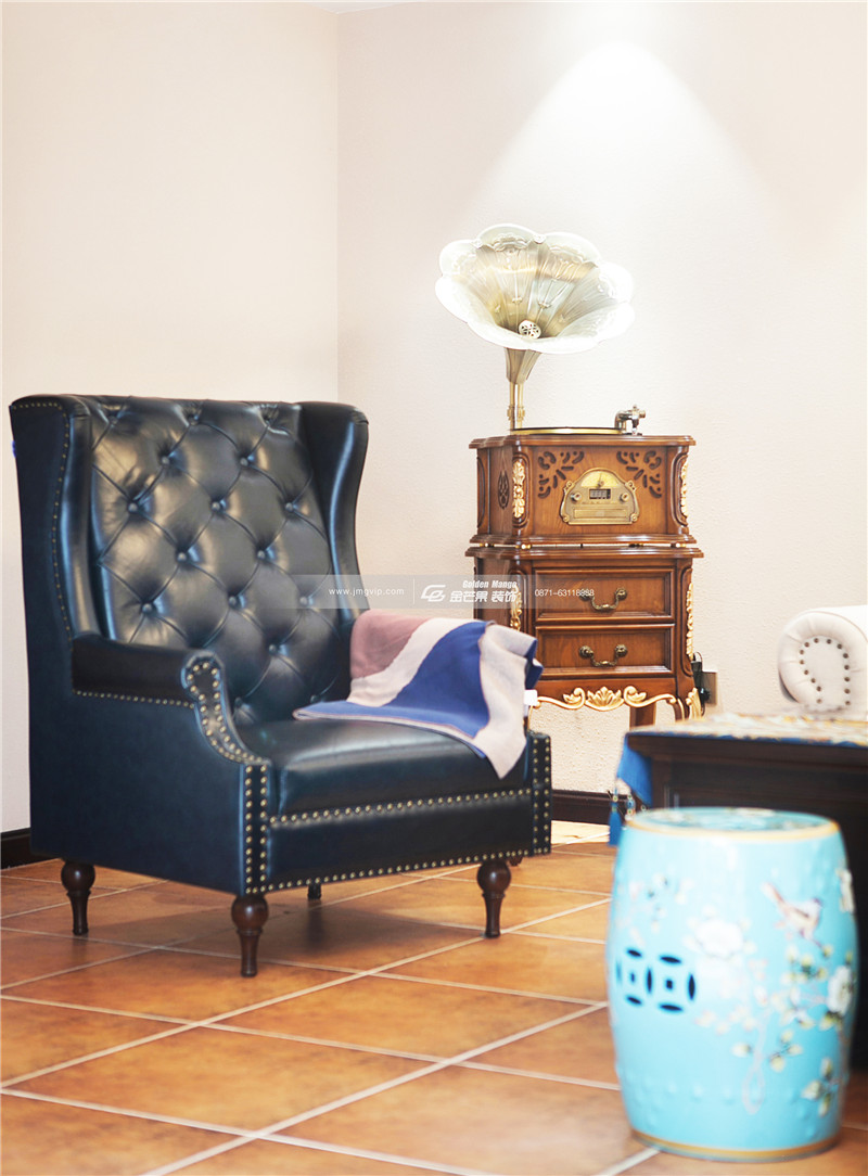 在復(fù)古氛圍的基礎(chǔ)上加上了現(xiàn)代的元素,粉嫩的顏色為空間注入了一絲清爽的氣息,墨藍的沙發(fā)彰顯別樣的浪漫與優(yōu)雅。藍色的鼓凳清新、經(jīng)典。