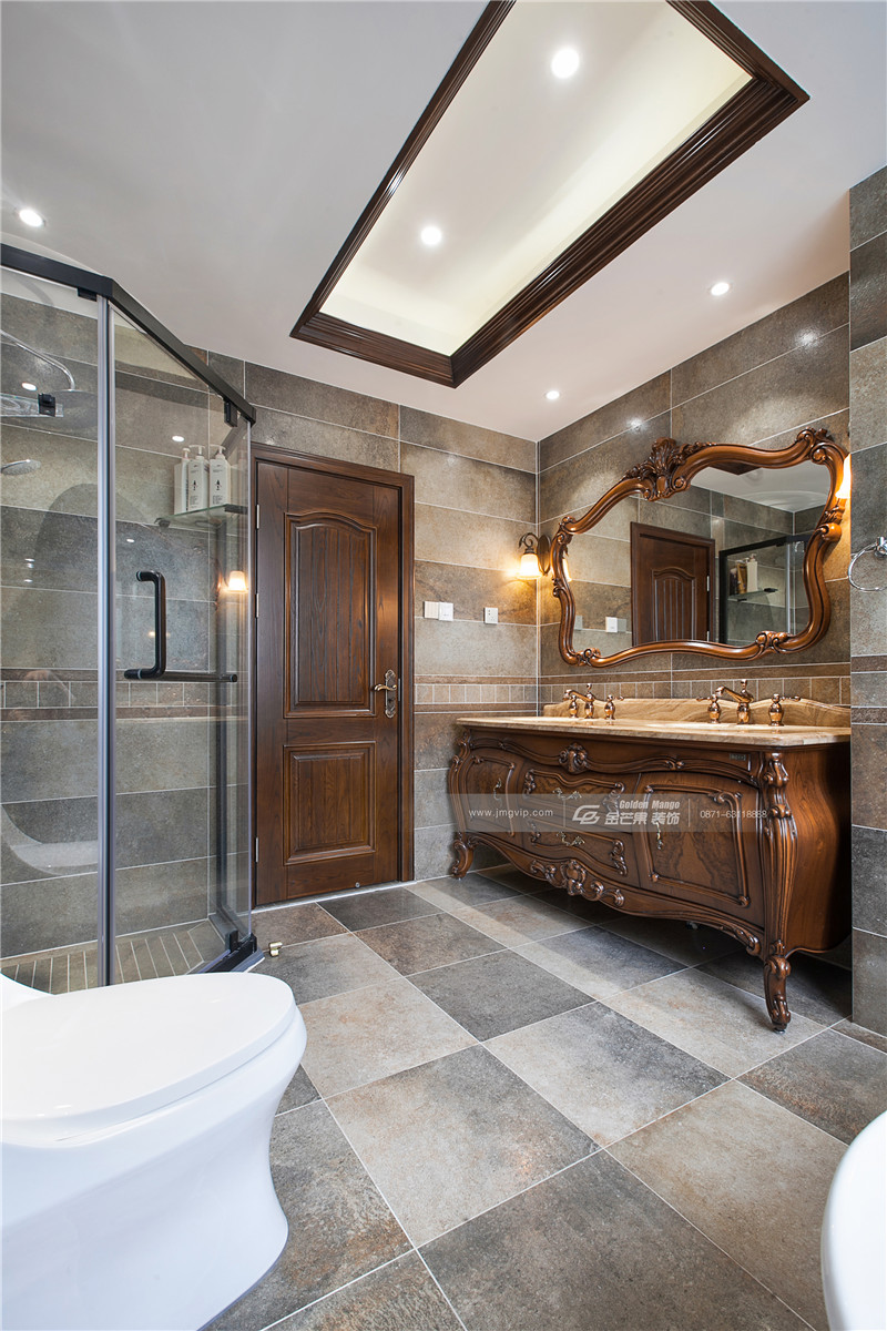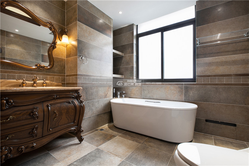 仿古磚上墻,雕花復(fù)古的臺盆和鏡子營造高級的奢華感。