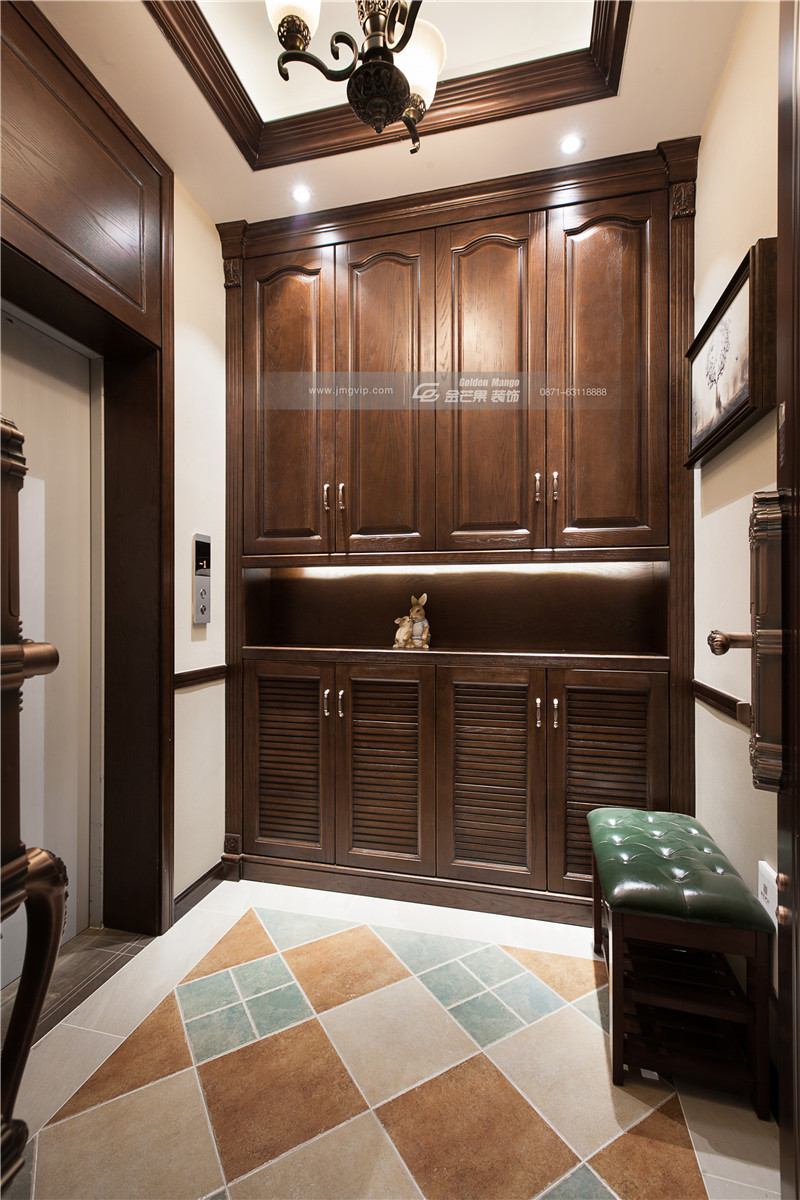 玄關(guān)處設(shè)置柜體,符合整體空間的氛圍,且增加了大量的儲物功能。