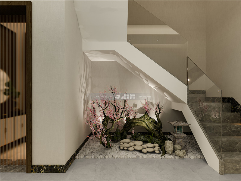 運用大量原木家具,打造雅致秀麗的中式氛圍。運用地板的材質作出空間隔斷,形成一種相互呼應、相互補充的空間美感。