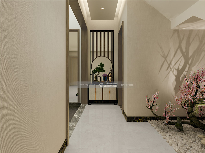 魚與花的圖案寓意富貴,和玄關處青松圖案相呼應。