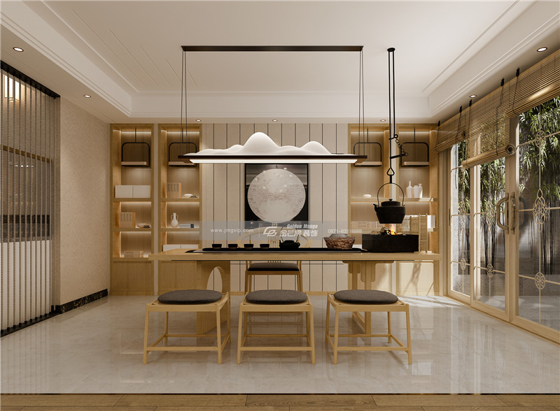 春水烹茶,把生活過成詩。茶香裊裊,怡然自得。遠處的裝飾畫和近處的燈飾融為一體,營造“海上生明月”的悠遠意境。