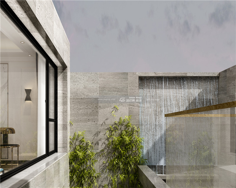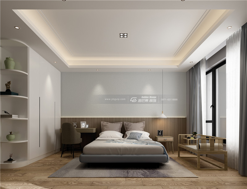 床頭背景墻蘊藏巍峨的群山,似有若無,營造寫意的美感。