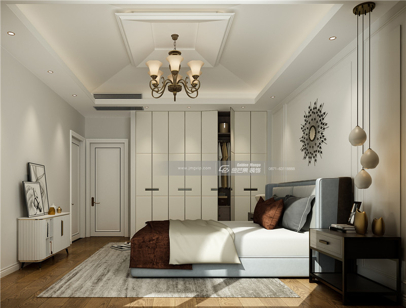 吊頂的設計打造皇室宮廷般的感覺,床頭飾品展現別樣的歐洲風情,燈飾造型簡單,卻為空間注入了靈動與活潑。
