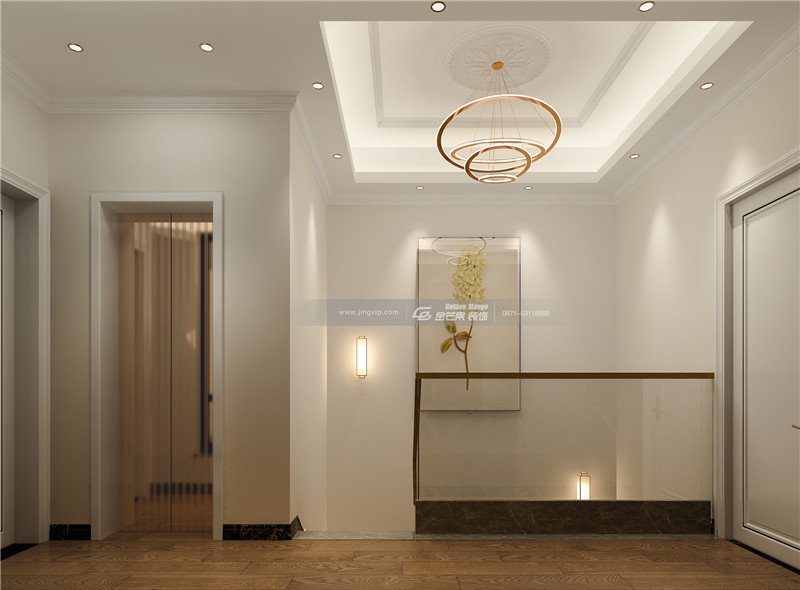 客廳和樓梯隔斷運用曲線、金色鐵藝等元素,增加奢華感,彰顯華貴和精致。正對面是寬大的落地窗,二者繁與簡的對比,體現空間感。