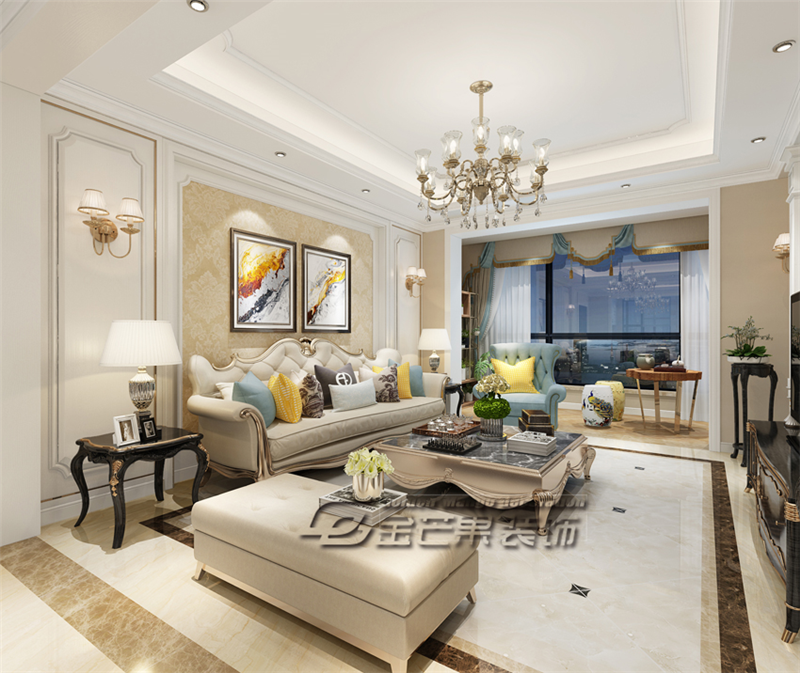 整體空間以象牙白為主色調,點綴一些亮色的家具,點亮整體空間,增加溫馨的感覺。歐式的家具鍍金鑲邊增加奢華感,水晶燈也是在歐式風格的塑造中常見的元素。鐵藝的家具和金色的擺件,營造尊貴典雅的感覺。宮廷風的窗簾也很好的貼合了歐式風格。