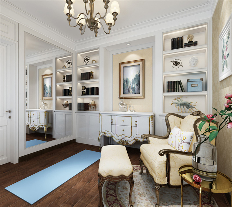 白色的書柜和展示架搭配優雅的壁紙,干凈又不失品味,金色的鑲邊和白色的家具搭配高貴優雅。歐式的椅子和歐洲風情的地毯搭配得恰到好處,金色的鐵藝架和一只優雅的鮮花,充滿了歐洲浪漫風情。