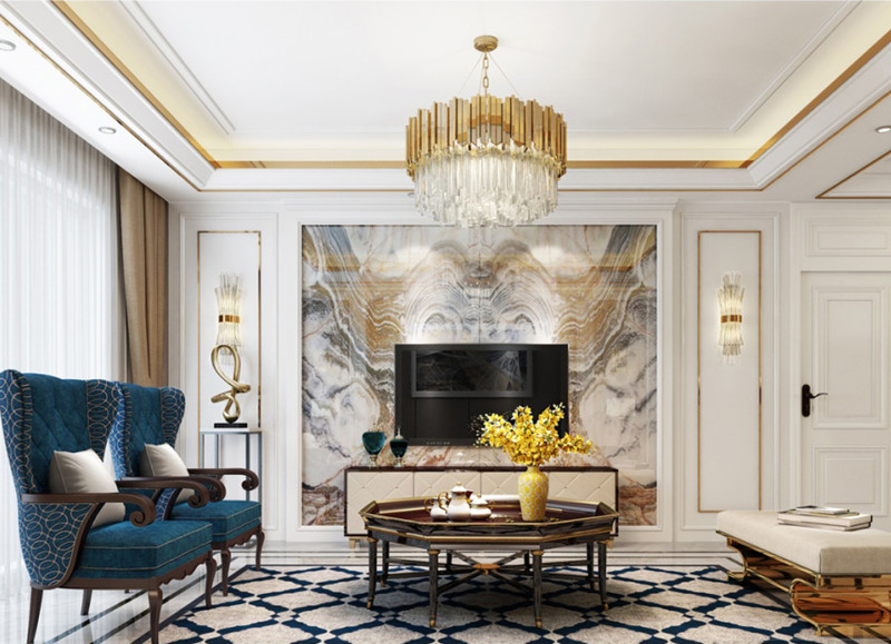 整體以淺色為主,深色為輔。藏藍(lán)色的座椅高貴、優(yōu)雅,和鐵藝的家具搭配相得益彰。地毯和座椅搭配的恰到好處,營(yíng)造雍容華貴的感覺。電視背景墻豐富空間層次,水晶吊燈增加奢華感。