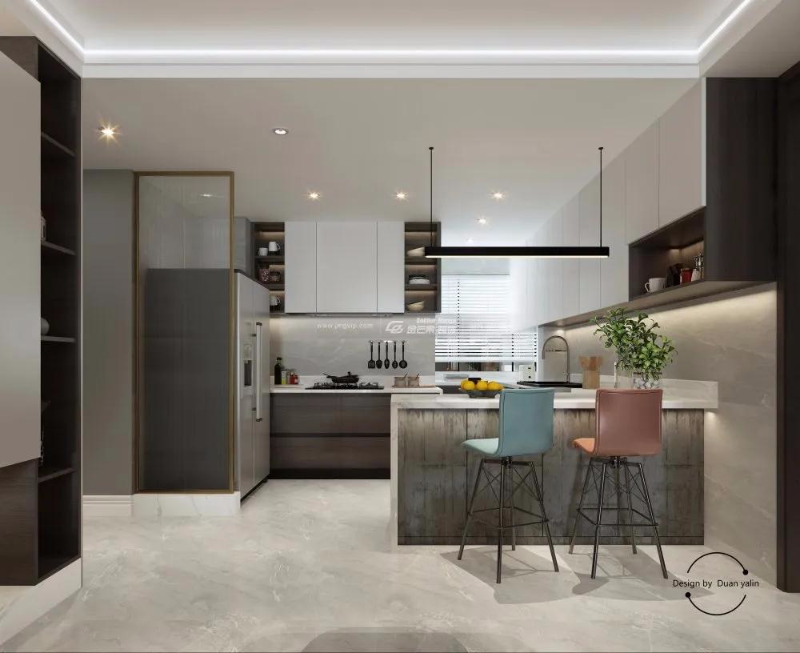 餐廳兩邊設計了一組立柜和一組吊柜,對稱又不會過于死板,增加儲物的同時也增強了整體空間的層次感。客餐廳吊頂結合燈槽走邊,減少直接照明,使整體光線更加柔和溫馨。