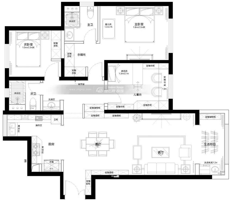 缺點:廚房和生活陽臺空間過小;入戶即過道,且過道空間浪費過大。