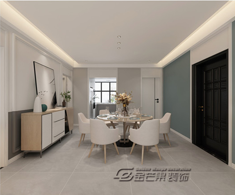 餐廳整體延續(xù)客廳的風(fēng)格,與客廳相協(xié)調(diào)。白色為底使空間更加開闊,淺灰色地磚和灰色半墻營造層次感,用綠色使整體氛圍更加生動(dòng),再以帶原木色的矮柜、餐桌椅點(diǎn)綴,整個(gè)餐廳清新自然,充滿文藝氣息。