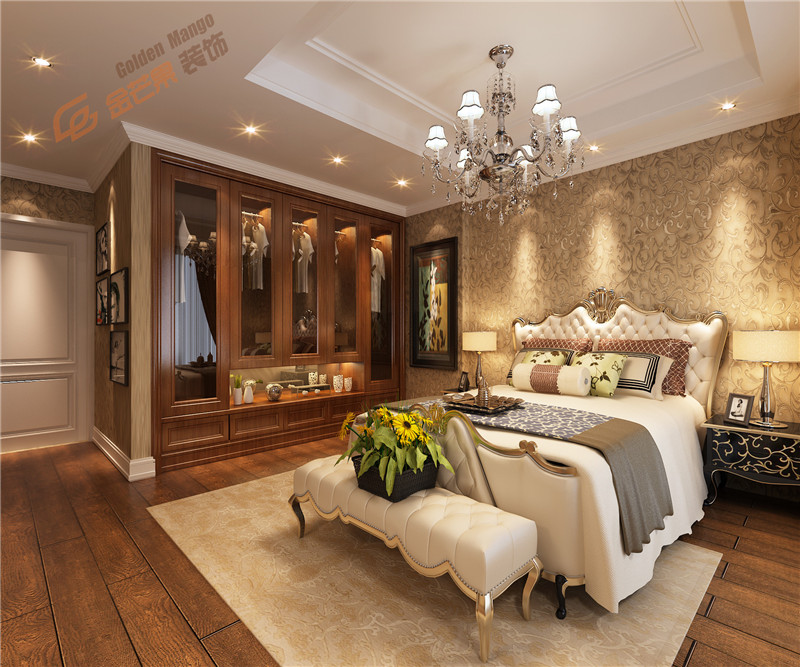 歐式的床具吊燈搭配棕色的家具,歐式花紋的壁紙營造尊貴典雅的氛圍,低調舒適,透明的衣柜門時尚大氣。