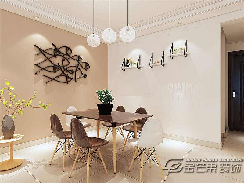餐廳是以簡單的原木餐桌椅為主,簡單純粹。墻上的裝飾畫充滿趣味性,讓整體空間不會對于單調(diào)。綠植讓空間充滿生機(jī)。三個白色的吊燈有一些森系和空靈的韻味,讓業(yè)主享受浪漫又悠閑的森系生活。