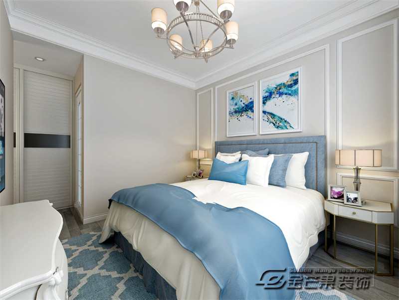 歐式的的窗簾搭配黑色的線條,精致又氣質,延續整體空間清新、優雅的藍白色調,營造優雅、舒適、溫馨的就寢空間。墻上的寫意裝飾畫為整體空間營造藝術感。