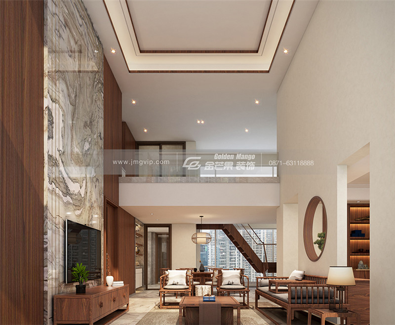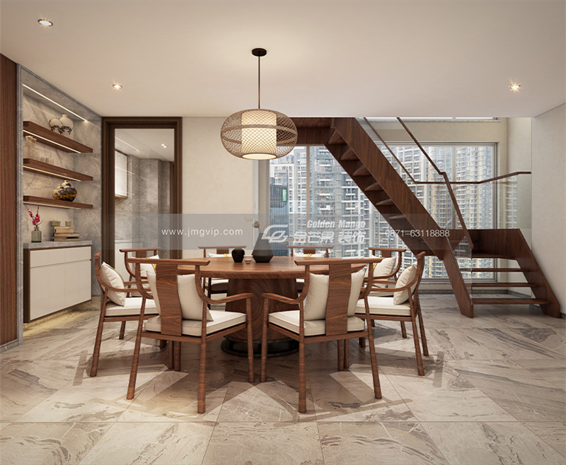 整體空間的設(shè)計是高端大氣的,躍層的設(shè)計讓整體開闊的空間充滿了更多的可能性,增加了空間的層次感和設(shè)計感。木質(zhì)的桌椅搭配石材的電視背景墻,沉穩(wěn)、大氣又典雅時尚。沙發(fā)背景墻上鑲嵌的圓形墻洞,充滿設(shè)計感,又增添房間古色古香、雅致的韻味。