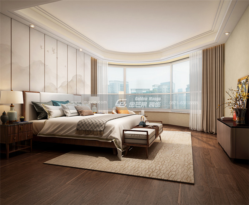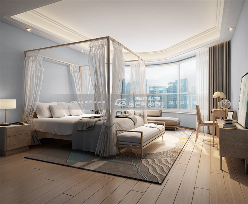 寬大的玻璃窗讓房間變得通透、明亮,曲線的設(shè)計讓房間更具有設(shè)計感和溫馨感,木質(zhì)的地板端莊大氣又優(yōu)雅。