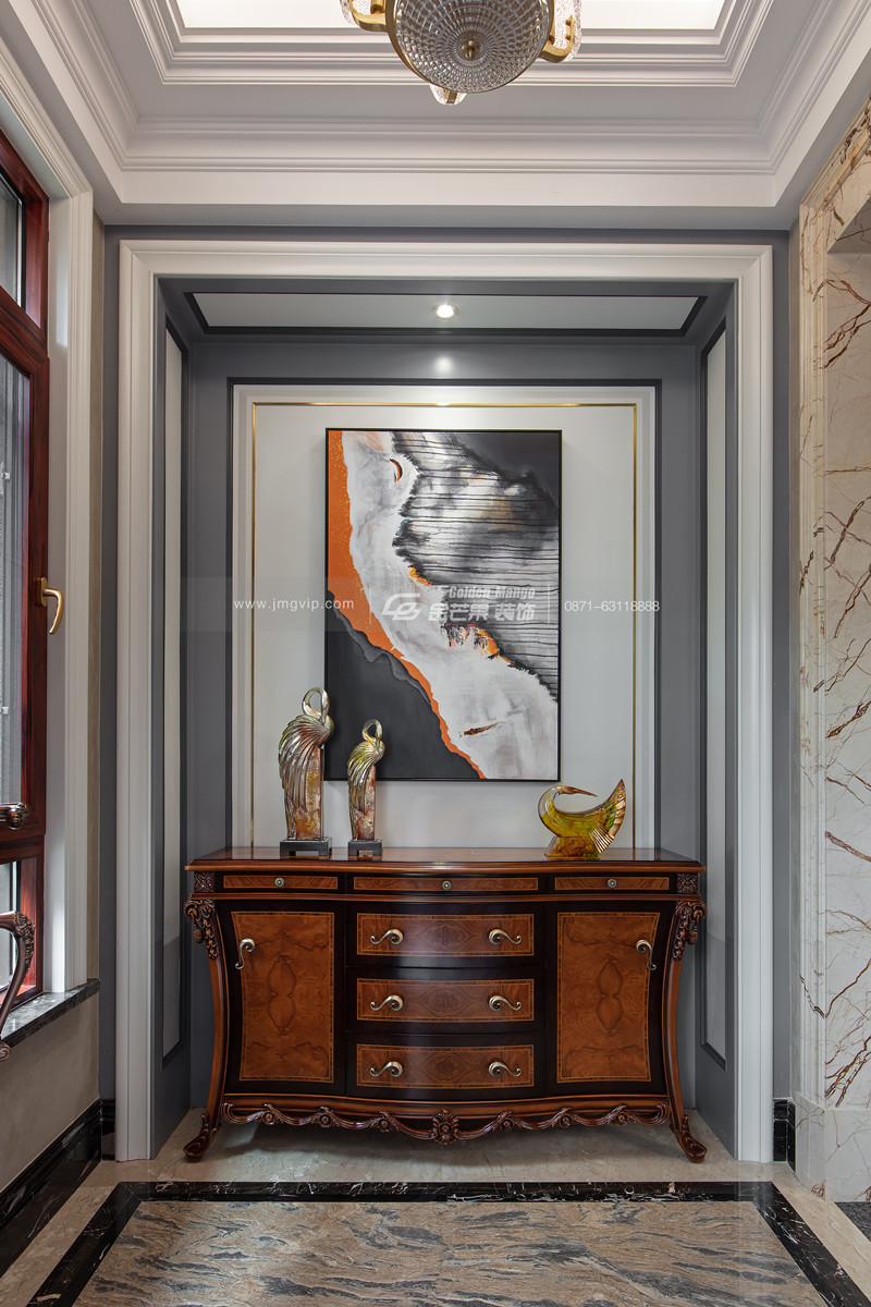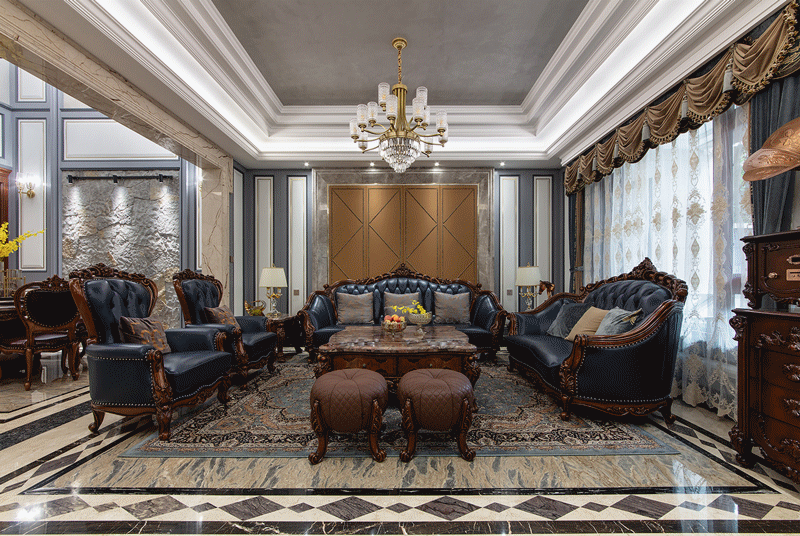 雕花燈槽彰顯低調的華麗,增添幾分奢華的味道。墨藍色沙發格調盡顯,運用貫穿其中的皮革元素,搭配古樸、復古的造型,營造宮廷皇室般的感覺。西方復古元素的地毯,更顯貴氣。