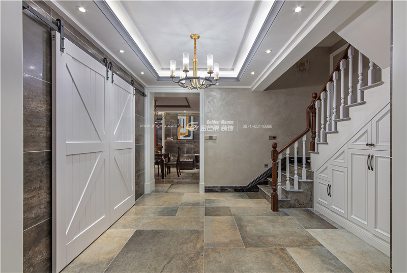 位于負2樓的入戶,光線稍有欠缺。大面積的白色空間簡雅高貴,在一定程度上讓空間更顯明亮和通透。復古地磚,一入戶即是貴氣雅致的感覺。